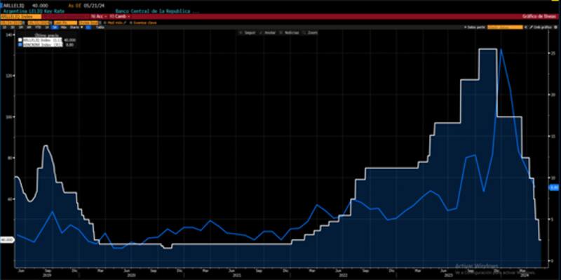 "El nivel actual de tasa de política monetaria genera una tasa Badlar que se ubica en 31,2% implica un ritmo mensual del 2,6%, un nivel que ya se acerca mucho al ritmo de crawling peg del 2% mensual. Una nueva baja de 10 puntos ya dejaría a la tasa Badlar por debajo del ritmo de crawling peg, generando un fuerte desincentivo a la liquidación de divisas por parte de los exportadores. Por lo tanto, entendemos que un nuevo recorte de tasa de similar magnitud luce poco probable o implicaría un riesgo alto", detalló.