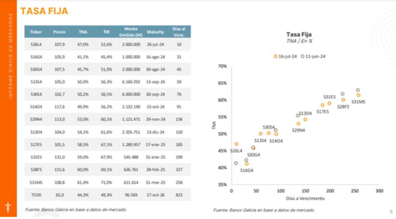 "Preferimos posicionarnos en la letra a septiembre (S30S4) ya que es un horizonte relativamente corto y ofrece un devengamiento levemente por encima del 4% TEM, representando un 50% TNA. Si bien estos instrumentos tienen liquidez en mercado, preferimos tratar de mantenernos a vencimiento y buscar rollear los mismos a través de las licitaciones primarias que ofrece el Ministerio de Economía", sostuvo Di Napoli.