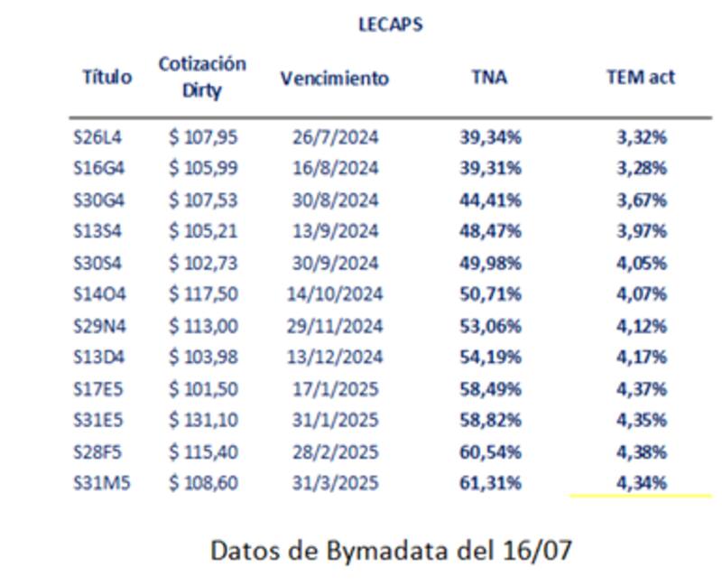 "Nuestra recomendación es estar en el tramo medio de la curva de Lecap, apuntado a septiembre y octubre. Esa Lecap paga unas tasa mensual por encima del 4%, con un premio importante contra la Lecap más corta. Para las letras de septiembre y octubre nos sentimos cómodos. Para tramo más largo directamente preferimos algo indexado", detalló Mazza.