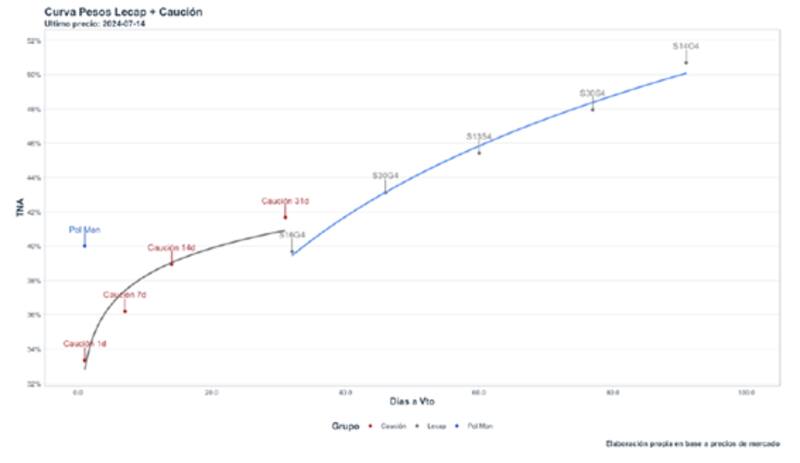 Actualmente, la curva de Lecap opera con tasas de 40% (TNA) en el tramo muy corto, saltando a niveles de entre 45% (TNA) y 50% (TNA) y con tasas máximos en el tramo mas largo por encima de 60% (TNA).