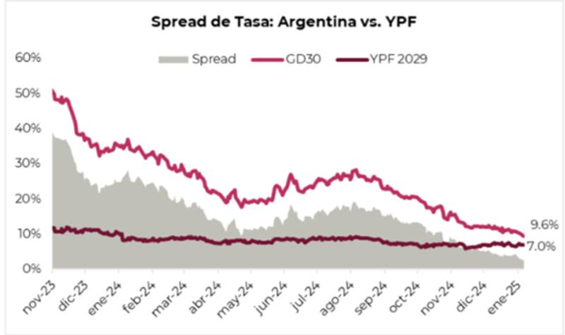"Estos bonos son menos sensibles al riesgo político-económico argentino. Hoy, los bonos corporativos ofrecen rendimientos de entre 7,0% y 7,5% en el tramo largo. Aunque estos rendimientos son menores al soberano, la diferencia es considerablemente menor que en otros momentos. Hoy el diferencial entre bonos de YPF con el soberano es 2,6 puntos, cuando hace poco más de un año, el mismo estaba mucho más cerca de los 30 puntos", explicaron.