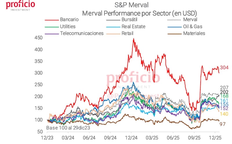 “Los que en la primera etapa del actual régimen económico se habían posicionado como ganadores hoy muestran un desempeño rezagado. Entre el 31 de octubre y el 4 de diciembre, los sectores de oil & gas, materiales y servicios lideraban las subas, mientras que los bancos se mantenían entre los perdedores. Desde entonces, se observa una rotación sectorial hacia los activos que habían quedado atrás, destacando la recuperación de bancos, Cresud e IRSA”, indicó Tessio.