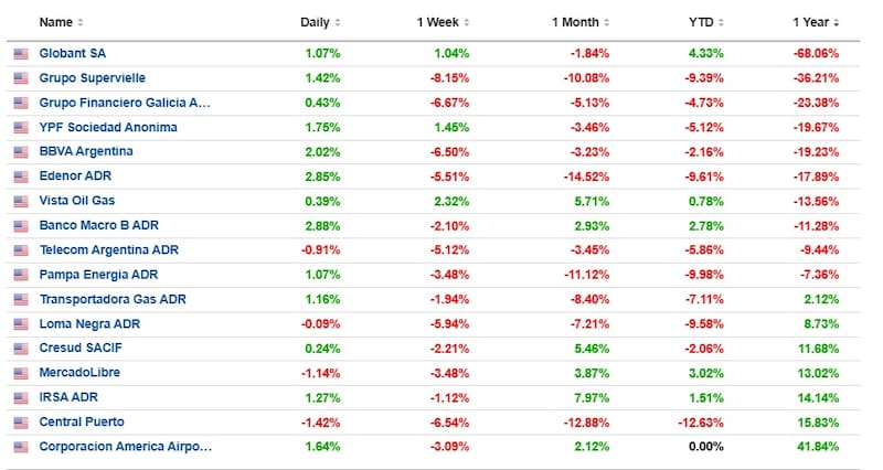 En cambio, acciones como Corporación America, Central Puerto, IRSA, Cresud, MercadoLibre, Loma Negra y TGS, evidencian ganancias de entre 2% y 40% en el ultimo año.