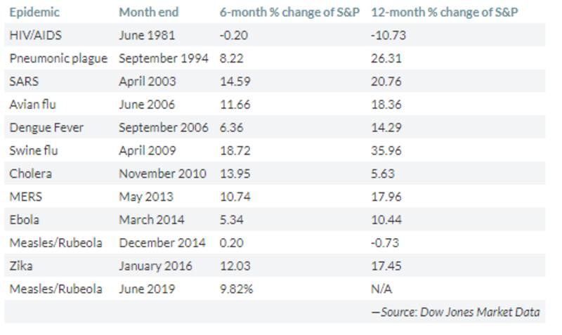 Según Dow Jones Market Data, el selectivo S&P 500 registró una ganancia del 14,59% seis meses después de la primera aparición de SARS en 2002. Aproximadamente 12 meses después de que se haya generado el brote, el índice de referencia del mercado amplio la suba hasta los 20,7%.