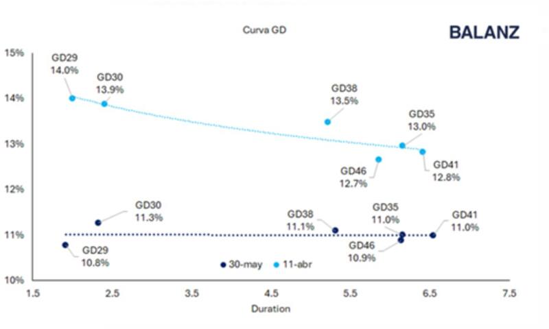 "Dentro del set de activos elegibles y por la estructura de cada uno de los bonos, creemos que los Globales 2035 que empiezan a amortizar más tarde, pueden dar mejor delivery por compresión que bonos más largos (GD38, GD41 Y GD46) en la relación riesgo retorno. Es decir, ofrecer una ganancia de capital del doble por encima de los bonos más cortos, pero similar respecto de los bonos más largos por su estructura", indicó.