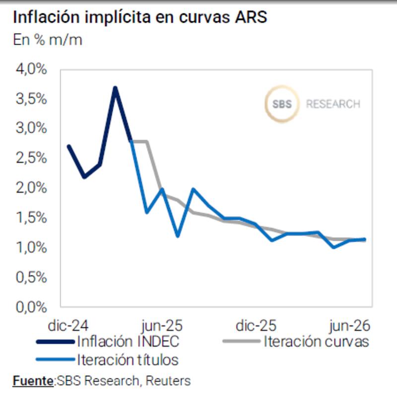 "Los bonos siguen cotizando en un escenario de fuerte desinflación, reflejado en una curva de rendimientos invertida, con tasas de inflación de equilibrio del 1,5 % mensual durante el resto de 2025. Sin embargo, este escenario supera nuestro escenario base, en el que prevemos una inflación del 22,7 % en 2025, frente al 25,7 % que el mercado estima", dijeron desde Research Mariva.