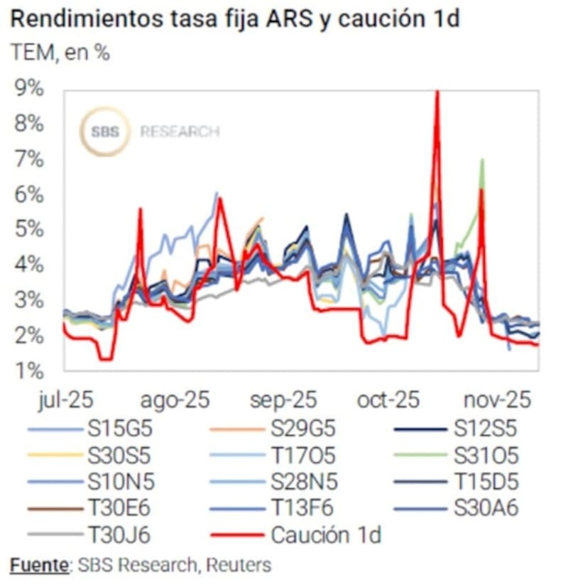 “Las tasas en pesos se mantienen en niveles relativamente bajos para compensar cualquier movimiento discreto del tipo de cambio, sobre todo considerando que un eventual reacomodamiento del tipo de cambio tendría un impacto inmediato en el rendimiento real de las estrategias en tasa pura”, alertó.