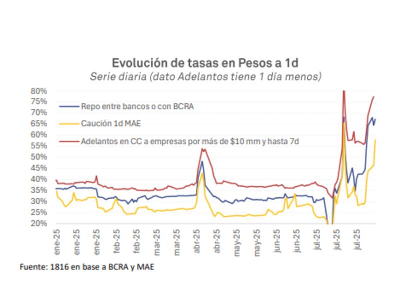 La dramática volatilidad de la tasa interbancaria también impactó a la caución bursátil, que registró subas importantes en lo que va de agosto, a pesar del aumento de 20 puntos en los encajes de los depósitos a la vista de Money Market y, más crítico aún para la actividad económica, de las tasas activas que financian el capital de trabajo de las empresas.
