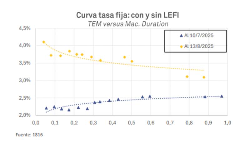 Sucede que el Ministerio de Economía colocó Lecap a 25 días a 4,36% TEM, muy por encima de la inflación de julio de 1,9%. Esto implica una tasa real anual en torno al 33% TEA, una señal clara de que los inversores exigen rendimientos elevados para compensar la pérdida de poder adquisitivo y los riesgos de liquidez.