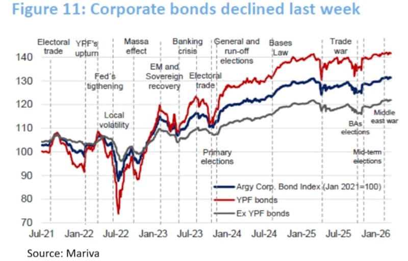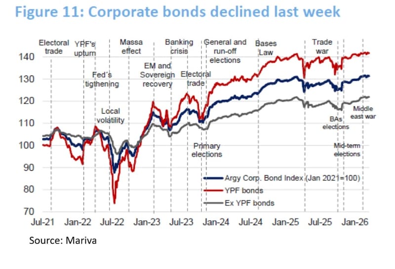 Por su parte, cuando se analiza la dinámica de los bonos durante la guerra comercial em 2025 y las elecciones legislativas el año pasado, la renta fija corporativa tuvo un mayor movimiento aunque significativamente menor que la deuda soberana.