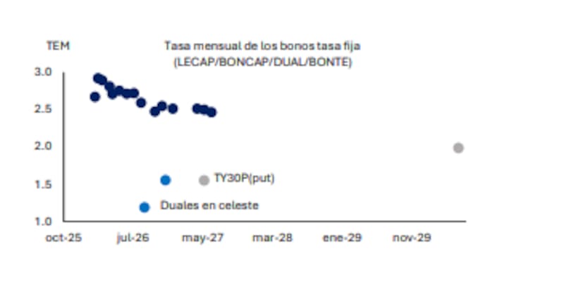 Por su parte, Martín D’Odorico, director de Guardian Capital y en diálogo con este medio, comentó que los los bonos duales en lo que encuentra mayor atractivo son los cortos (TTM26, TTJ26 y TTS26) porque tienen un nivel de duración manejable para hacer carry trade.