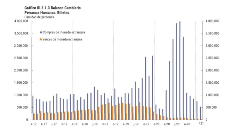 Sobre este último punto se destaca que durante febrero solo 536.000 personas compraron billetes -187.000 menos que el mes previo-, mientras que unos 35 mil vendieron, resultando así compras y ventas per cápita de u$s 184 y u$s 217. De esta manera, la cantidad de personas que adquirieron dólares en febrero fue la más baja desde marzo de 2020.
