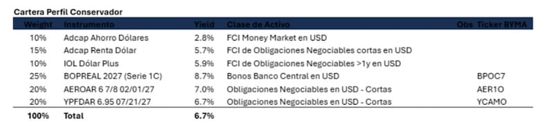 Para perfiles mas conservadores, la cartera recomendada de Adcap Grupo Financiero consta de un 35% en fondos (Adcap ahorro dólares, Adcap Renta Dólar y 10% en IOL dólar Plus), un 25% en Bopreal Serie 1C (BPOC7) y 40% en ONs (Aeropuertos Argentina 2000 a 2027 e YPF a 2027).