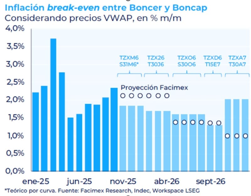 “El TZX26 es un bono cero cupón con vencimiento en junio del 2026 que ajusta su capital por la inflación a través del coeficiente CER y cancela el total del capital en esa fecha. Hoy rinde CER+5,8%, lo que lo convierte en una opción atractiva dada la baja inflación implícita en el mercado para los próximos meses. Esperamos que el rendimiento de este bono supere el de su par en tasa fija en el plazo de los próximos 6 meses”, indicaron.
