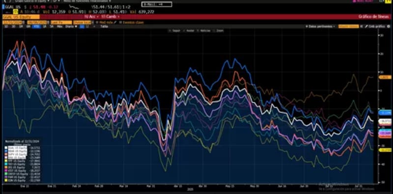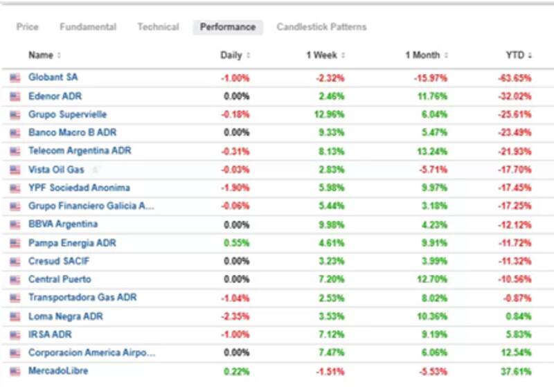 Además se encuentran Telecom, Vista e YPF que bajan entre 17% y 25% este año, a la vez que Grupo Financiero Galicia y BBV Argentina también caen 17% y 12% respectivamente.
