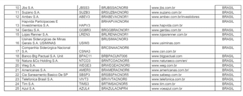 Vale, Petrobras, Banco Bradesco, Magazine Luiza, Banco Itaú Unibanco, Petro Rio, Banco Do Brasil, Localiza Rent A Car, Oi S.A, Jbs S.A, Suzano, Ambev, Hapvida Participacoes E Investimentos, Gerdau, Lojas Renner, Usinas Siderurgicas de Minas Gerais, Usiminas, Companhia Siderúrgica Nacional, Banco Btg Pactual, Natura &Co Holding, Weg, Americanas, Cia Saneamento Basico De SP, Telefonica Brasil, Tim S.A y Azul S.A.