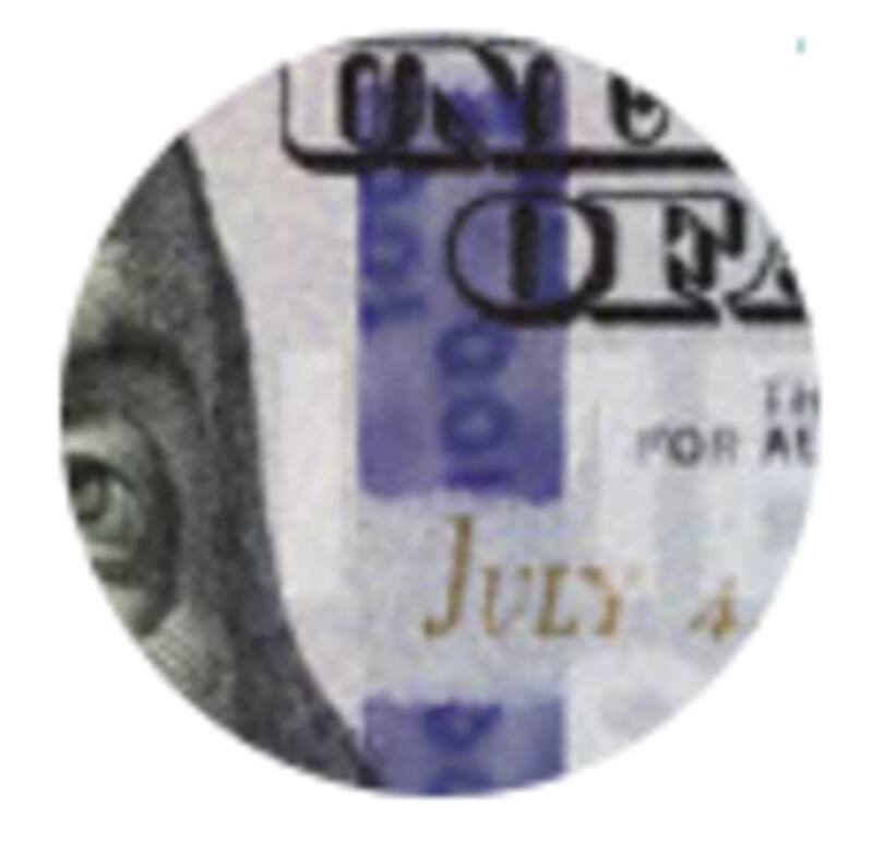 3) Marca de agua: mirá el billete a contraluz para ver la marca de agua que tiene el retrato, la cual está ubicada a la derecha del retrato de Benjamin Franklin. Esta área se ve desde la parte delantera y desde la parte trasera del billete cuando lo ve a contraluz.
