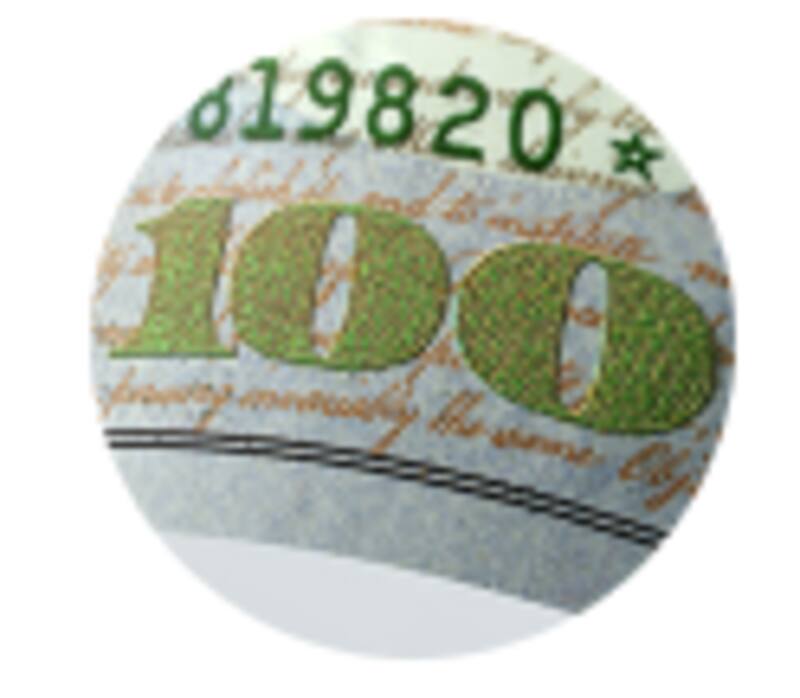 2) Tinta que cambia de color: el diseño actual del billete de $100 tiene tinta que cambia de color en la campana del tintero. Si inclinas el billete, la imagen de las campanas cambia de color cobre a color verde, un efecto que hace que parezca que aparecen y desaparecen en el tintero.