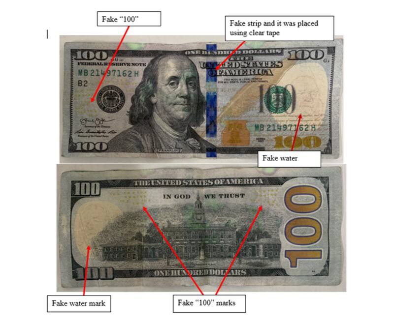 El Departamento de Policía de King City identificó tres marcas propias de las ediciones falsas: numeración; marca de agua, y la banda de seguridad pegada con cinta.