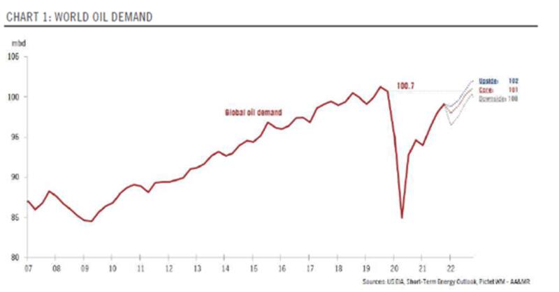 Desde Pictet esperan que la demanda de petróleo alance los 101 millones de barriles diarios a fines de 2022, 2 millones de barriles diarios más que los 99 millones de barriles diarios actuales.