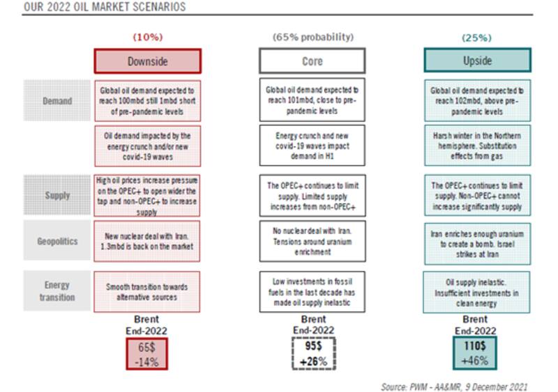 "Nuestro escenario principal (al que asignamos un 65% de probabilidad) es que el petróleo Brent alcance los u$s 95 por barril a fines de 2022 (25% de suba)", sostienen en Pictet.