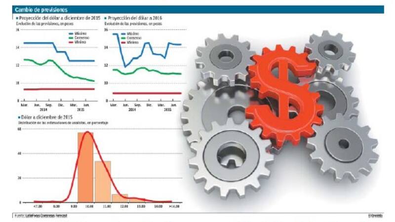 Las estimaciones de un grupo de 33 consultoras, bancos y fondos de inversión que responden cada mes a un sondeo privado arrojan que el consenso a partir del cual el mercado hace planes ubica al dólar a $ 10,23 para el cierre de este año y a $ 14,04 para fines del año próximo. La expectativa de que el Gobierno que asuma el poder tras las elecciones de octubre aplique políticas económicas más ortodoxas, sin embargo, no permite aspirar a una menor tasa de inflación para 2016, que estaría en el 32% para los mismos encuestados. Por el lado positivo, las expectativas de actividad económica para este año y el próximo suben levemente.