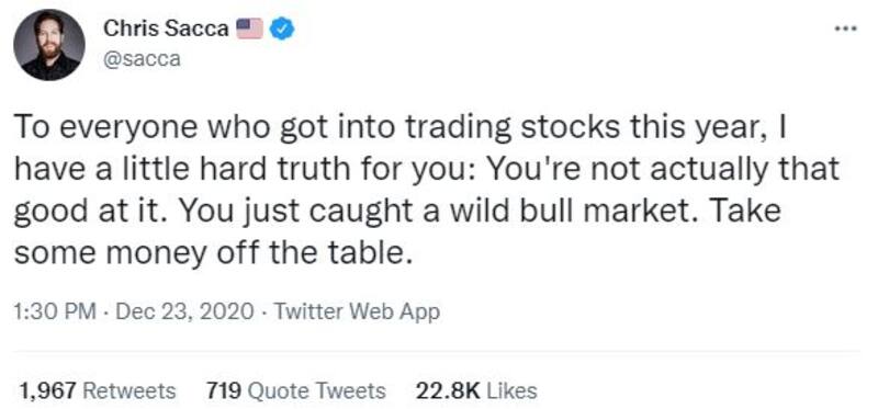 En primer lugar se ve una publicación en la que Sacca habla sobre los pequeños inversores. "A todos los que se metieron en la inversión con acciones este año, tengo una pequeña y dura verdad para ustedes: en realidad no son tan buenos en ello", escribió el 23 de diciembre de 2020 y luego agregó: "Acaban de pescar un mercado alcista salvaje. Saquen algo de dinero de la mesa".
