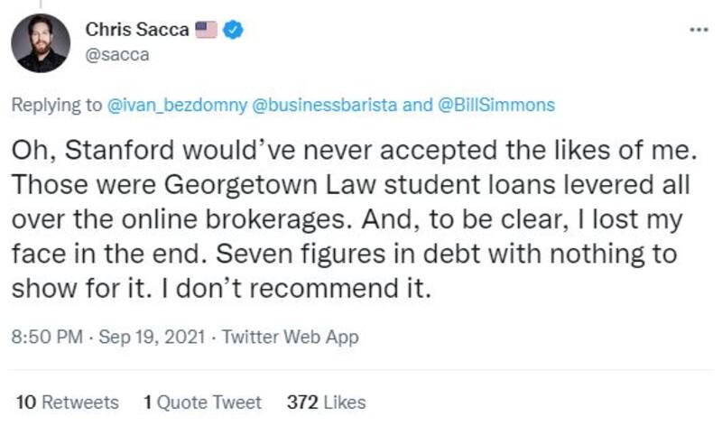 Por otro lado, el 20 de septiembre de este año recordó sobre su vida como inversor cuando era estudiante, escribiendo lo siguiente: "Oh, Stanford nunca habría aceptado a gente como yo. Eran préstamos para estudiantes de Derecho de Georgetown apalancados en todos los brokers online. Y, para que quede claro, al final perdí la cara. Siete cifras de deuda sin nada que mostrar. No lo recomiendo".