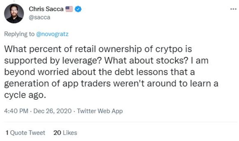 Tan solo dos días más tarde lanzaría una de sus opiniones más polémicas, al escribir el 26 de diciembre de 2020: "¿Qué porcentaje de la propiedad minorista de criptomonedas se apoya en el apalancamiento? ¿Y las acciones? Estoy más que preocupado por las lecciones de endeudamiento que una generación de traders de aplicaciones que no estaba en el mercado en el ciclo anterior y que debería haber aprendido".