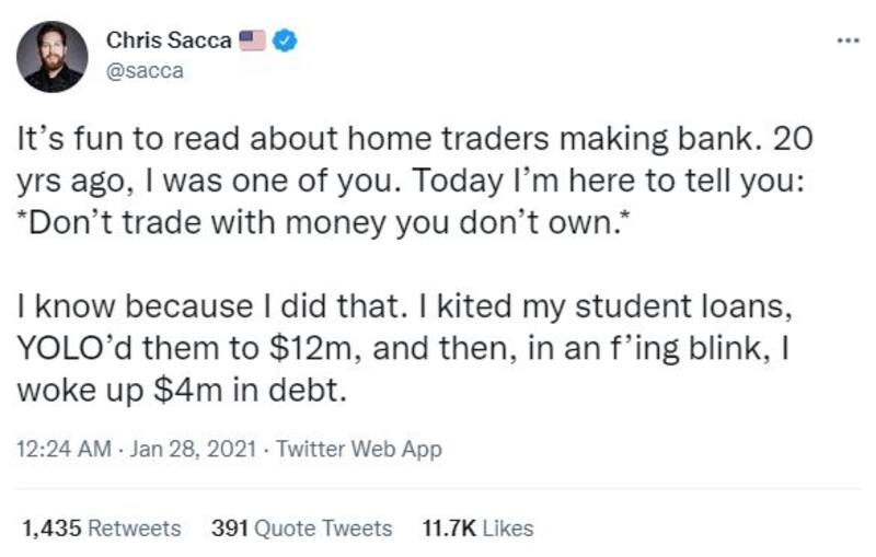 El 2021 lo estrenó con otro comentario sobre los pequeños inversores y como él se ve reflejado en ellos, ya que el 28 de enero publicó: "Es divertido leer sobre los traders caseros que hacen dinero. Hace 20 años, yo era uno de ustedes. Hoy estoy aquí para decirles: *No no operes con dinero que no te pertenece* Lo sé porque yo lo hice. Me puse a negociar mis préstamos estudiantiles, los arriesgue hasta llegar a los u$s 12 millones, y luego, en un maldito parpadeo, me desperté con u$s 4 millones de deuda".