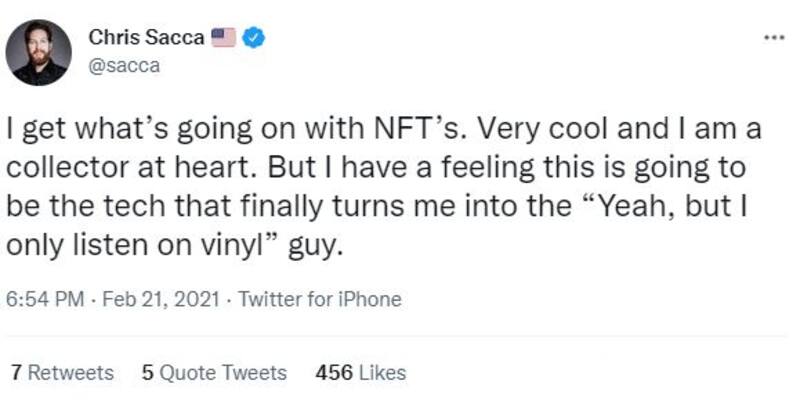 Su primera publicación destacada sobre criptoactivos recién el 21 de febrero, cuando dijo: "Entiendo lo que pasa con las NFT. Estoy muy copado y soy coleccionista de corazón. Pero tengo la sensación de que esta va a ser la tecnología que finalmente me convierta en el tipo ‘Sí, pero sólo escucho en vinilo'". Igualmente aclaró que no ve a este mercado como una burbuja.
