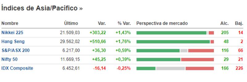 El índice Nikkei de la Bolsa de Tokio cerró con un avance de 303,22 puntos, un 1,43%, hasta situarse en 21.509 enteros.