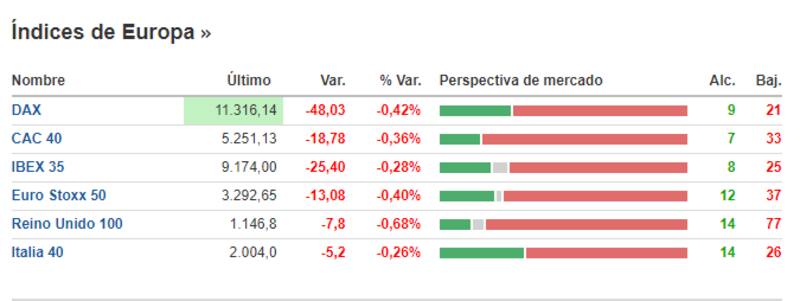El índice de grandes valores europeos STOXX 600 cede a penas un 0,1%, tras tres días de caídas, y el francés CAC 40 lideraba las pérdidas con un retroceso inicial de casi el 1% en el inicio, aunque avanzada la mañana achica el ronjo a una pérdida de 0,13%.