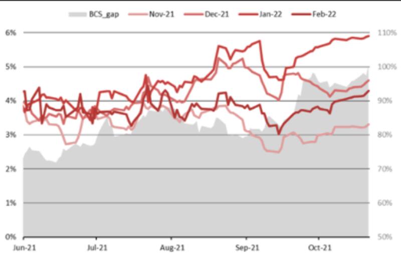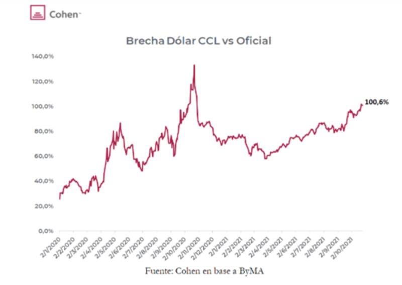 "La atención del mercado está puesta en el frente cambiario. No solo en cuanto al dólar oficial, que los futuros de Rofex están descontando depreciaciones mensuales en promedio del 5% para los meses desde diciembre hasta abril del 2022. Sino también sobre la brecha cambiaria, que hoy en día ya está en el 100%, con el contado con liquidación llegando a operarse en los $ 200 estos días", dijeron.