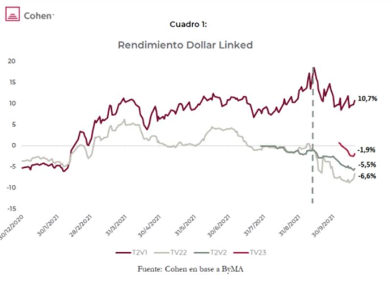 Tomás Ruiz Palacios, estratega de Cohen, dijo que con el bono dólar linked a 2022 (TV22) rindiendo 7 puntos por debajo de devaluación, la cobertura cambiaria a través de bonos dólar linked luce cara.