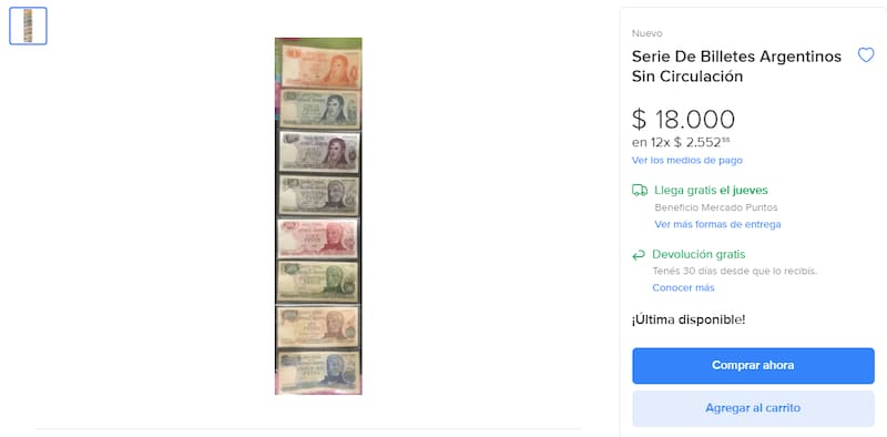 Así al explorar múltiples canales y plataformas de ecommerce pueden encontrarse con tasaciones que trepan hasta $ 18.000, tal como sucede con los billetes de pesos argentinos correspondientes a la serie de 1970.