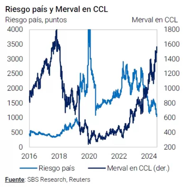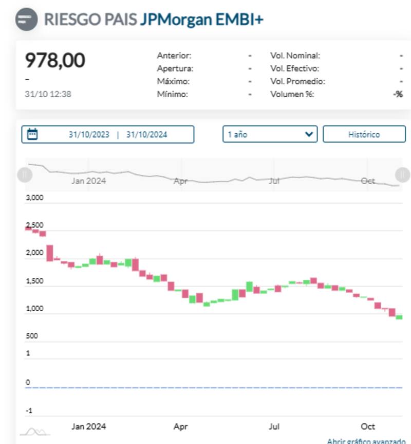 "Creemos que el Riesgo País seguirá comprimiendo en la recta final de año, sujeto a que el escenario global acompañe. El Riesgo País quebró hoy los 1000 puntos, fenómeno inédito para la historia reciente al considerar períodos con controles cambiarios", dijo Yarde Buller.