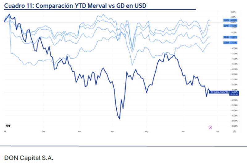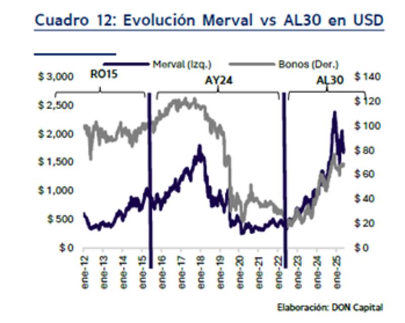 Los analistas de Don Capital explicaron que, desde inicios de 2025, las acciones locales mostraron una corrección más profunda que la deuda soberana en dólares, lo que genera un diferencial que deja a la renta variable en un punto de entrada más atractivo en términos de valuación y relación riesgo-retorno.
