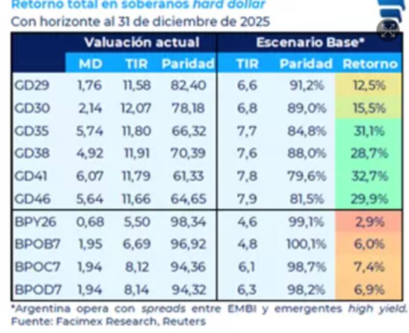 "En nuestro escenario base, los spreads de la deuda argentina estarán entre el EMBI (296pbs) y los emergentes high yield (410pbs) hacia fin de año, consistente con un escenario donde Argentina ya estará en condiciones de acceder al mercado. Esto favorecería particularmente a bonos largos como GD41 y GD35. La reinversión de los cobros de cupones y amortizaciones puede ser un driver adicional para las valuaciones", consideró Yarde Buller.