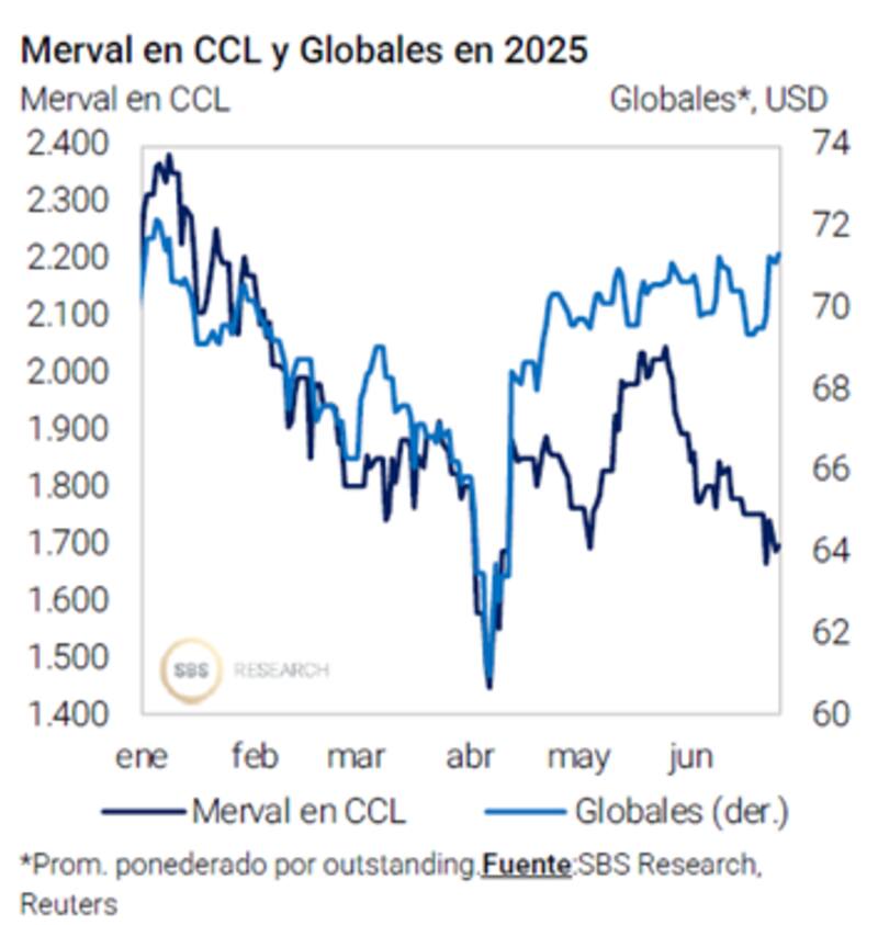 Sin embargo, el rebote del riesgo país desde los mínimos de 2024 hizo que el rally en las acciones se frene. Las acciones necesitan que el riesgo país se ubique en niveles más deprimidos para que el rally en los papeles se amplíe.