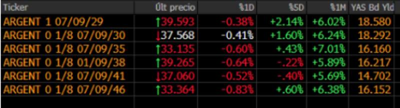 La parte corta de la curva retrocede un 0,38% y un 0,4% para los Globales 2029 y 2030. En tanto, en la parte media de la curva se ven caídas de 0,6% mientras que en el tramo más largo, los Globales 2041 y 2046 retroceden 0,52% y 0,83% respectivamente.