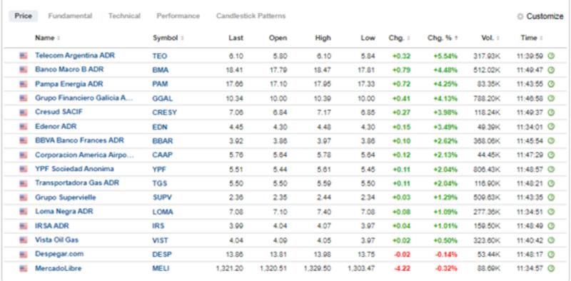 Yendo a la renta variable, vemos que las acciones argentinas en Wall Street se siguen disparando. Las ganancias son lideradas por las acciones de Telecom que ganan 5,54% en lunes, seguida por Banco Macro, Pampa y Grupo Financiero Galicia que suman 4,48%, 4,2% y 4,1% respectivamente.