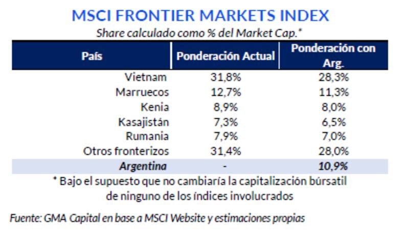 Actualmente, Argentina tiene una ponderación del 0,12% en mercados emergentes. En caso de convertirse en fronterizo, la participación ascendería a 11% dentro del nuevo grupo bajo el supuesto de que se mantuviera la actual capitalización bursátil del índice de Argentina y de las otras economías con este status.