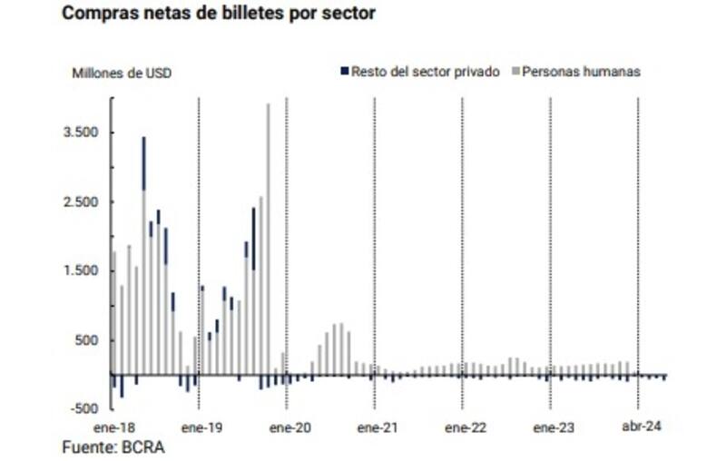 Así según los últimos datos, las personas humanas efectuaron ventas en abril por u$s 14 millones y compraron billetes por USD 9 millones en el mercado oficial de cambios.
