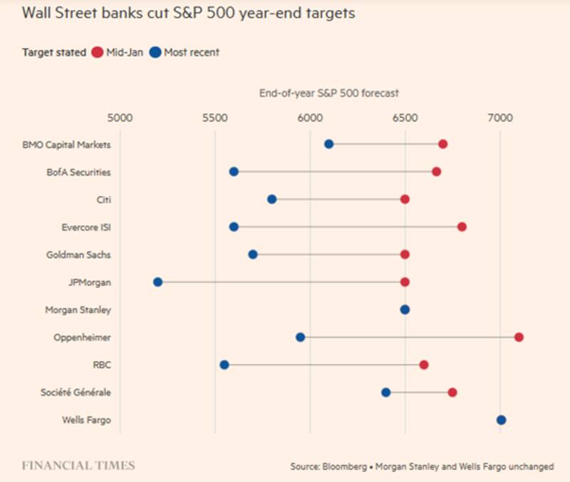 El banco de inversión BMO redujo su estimación de este año para el S&P500 desde 6750 a 6300 puntos. Por su parte, Bank of América (BofA) redujo desde los 6700 a 5600 puntos su expectativa para el S&P500.