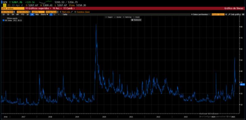 A su vez, la volatilidad se disparó este año a máximos desde la pandemia, con el VIX alcanzando niveles de 50 puntos, para luego retroceder hasta los valores actuales de 28 puntos.