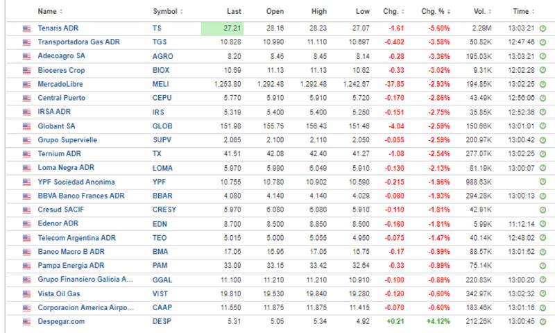 En lo que respecta a las acciones, estas muestran descensos en su mayoría. Las acciones de Tenaris pierden 5,6%, seguido por TGS, AdecoAgro, Bioceres, Mercadolibre y Central Puerto, que bajan entre 3,5% y 2,9%.
