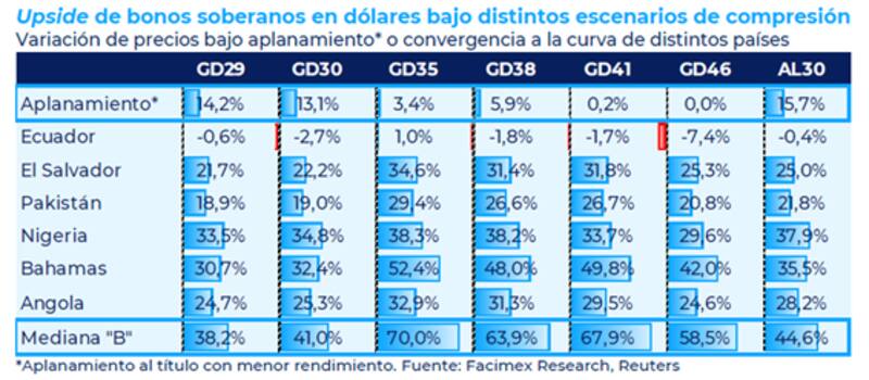 Según cálculos de Facimex Valores, en el caso en el que la curva soberana argentina converja hacia los rendimientos de créditos similares, el GD35 es el que mayor potencial alcista presenta.