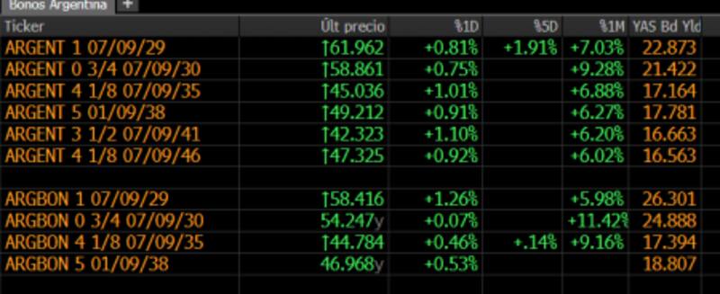 Por su parte, en los títulos más largos, el Global 2041 avanza 1,1% y el Global 2046 registra ganancias de 0,92%.