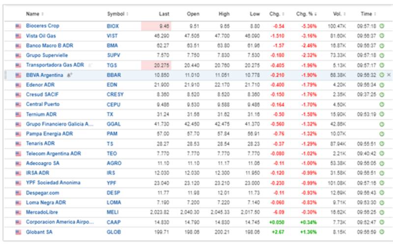 Las mayores debilidades se dan en Bioceres, que baja 5,3%, seguida por Vista, que retrocede 3% y Banco Macro, con una merma de 2,5%.